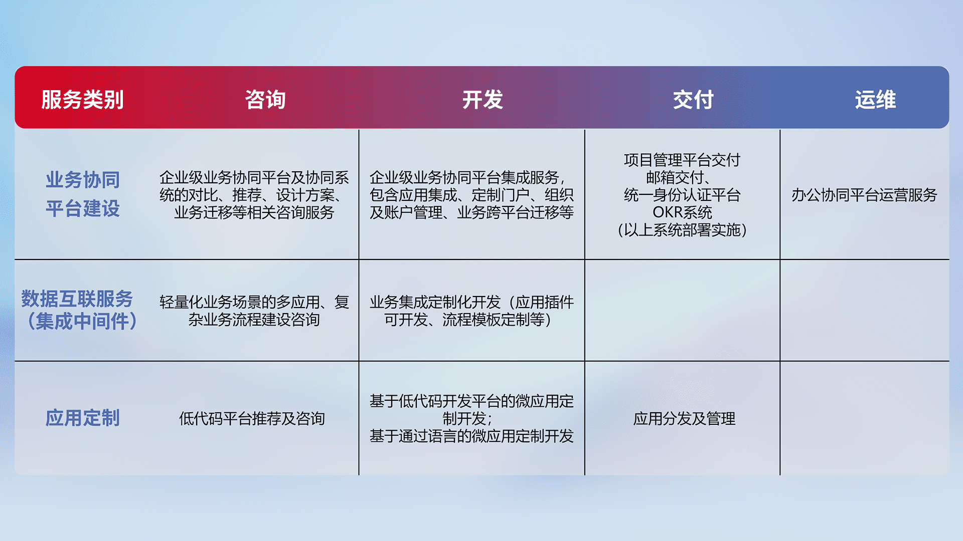 针对钉钉、、企微、、、IDaas等平台级产品提供产品的规划、、、、方案、、、、交付、、、定制化开发等服务,,,实现如统一协同办公、、智能客户服务、、、、混合会议管理、、智能数据查询、、、、等业务场景,,,实现数字化转型。。